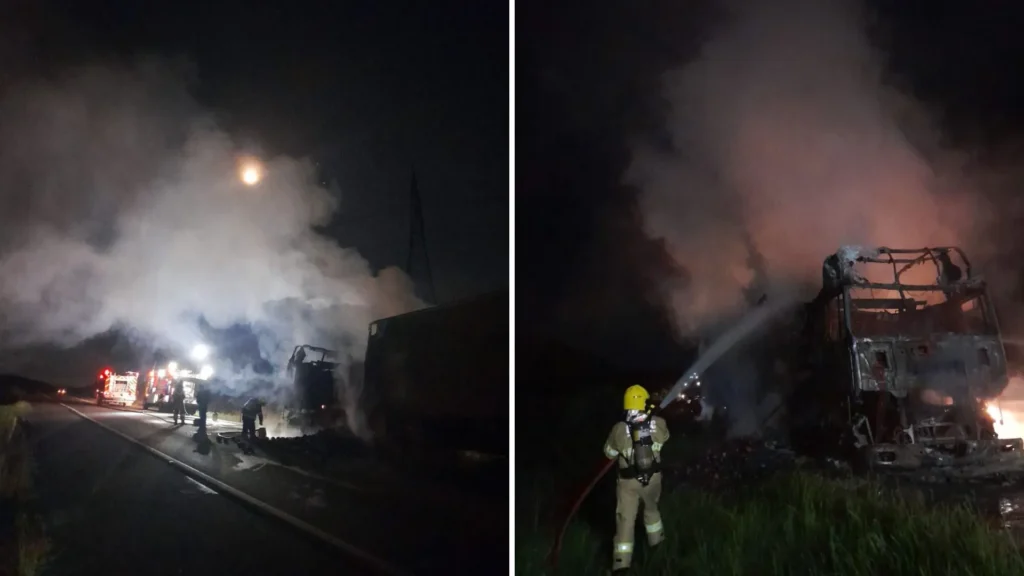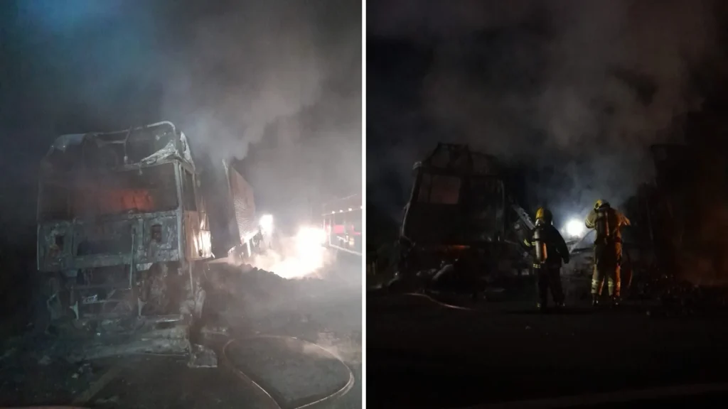 A ocorrência envolveu uma carreta baú carregada com embutidos, que já apresentava chamas em fase de desenvolvimento completo no momento da chegada das equipes.