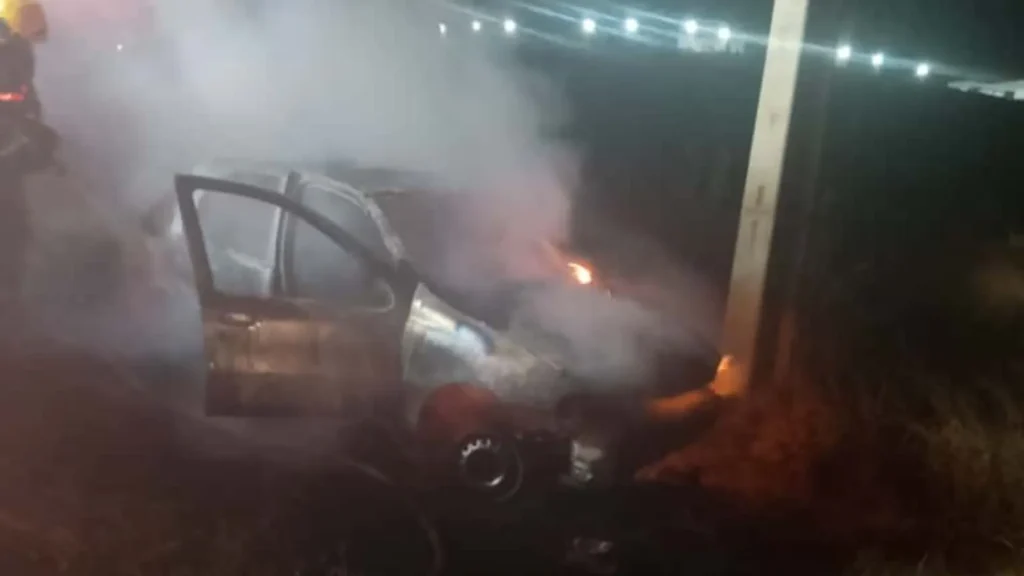 Ao chegarem à cena, os bombeiros identificaram que um automóvel modelo Fiat Palio, com placas padrão Mercosul, estava totalmente tomado pelas chamas.
