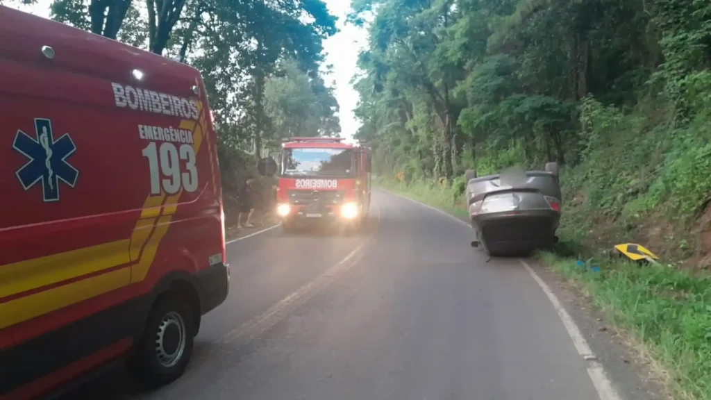 Um jovem de 18 anos capotou um Chevrolet Prisma com placas de Abelardo Luz na madrugada deste sábado (7) na SC-464, em Salto Veloso, no trecho que segue para Arroio Trinta, conhecido como curva do Bambim. O Corpo de Bombeiros de Salto Veloso estava em deslocamento operacional quando encontrou o acidente por volta das 05h29. O motorista havia saído do veículo e caminhava pela cena, consciente, orientado e sem ferimentos aparentes, relatando apenas vertigem e episódios de emese.