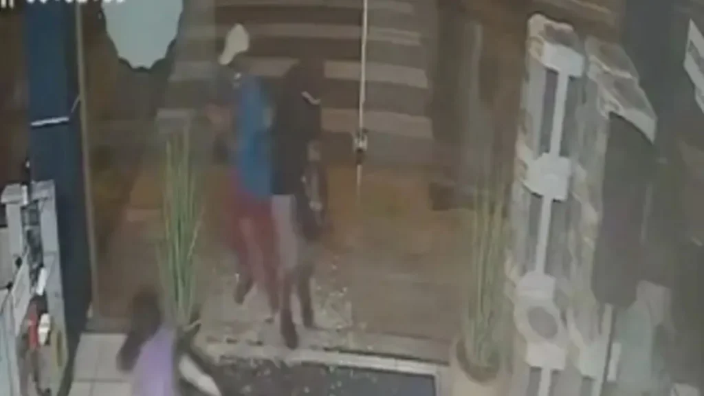 De acordo com as imagens de segurança, um dos criminosos arremessou uma pedra contra a porta principal da loja, quebrando o vidro.