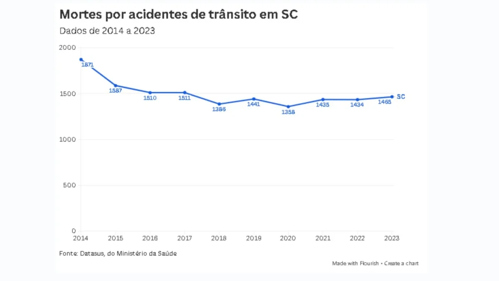 Santa Catarina registrou crescimento no número de mortes no trânsito nos últimos três anos, seguindo tendência nacional de alta em óbitos por acidentes desde 2020. Dados do Datasus, do Ministério da Saúde, indicam que o Estado contabilizou 1.465 mortes em 2023, o maior número desde 2017, considerando pedestres, ciclistas, motociclistas e ocupantes de automóveis, caminhões e ônibus.