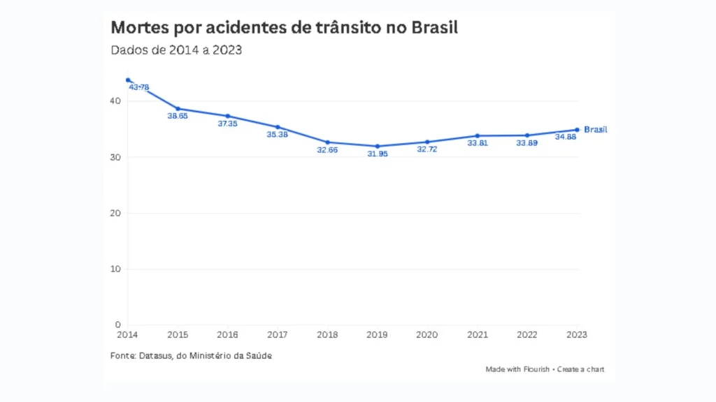 Em 2019, o Brasil registrou 31.945 mortes por acidentes de trânsito, número que subiu gradualmente até alcançar 34.881 em 2023, praticamente repetindo o índice do ano anterior, com alta de 6,6% desde 2020.