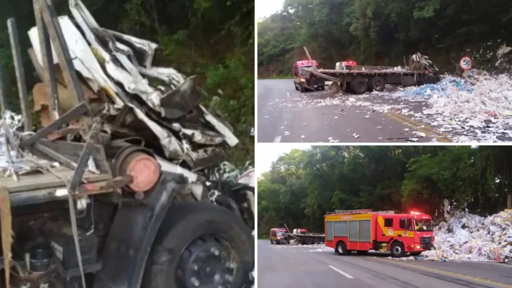 O caminhão, com placas de Benedito Novo/SC, perdeu o controle na descida e acabou fora da pista, espalhando parte da carga pela rodovia.