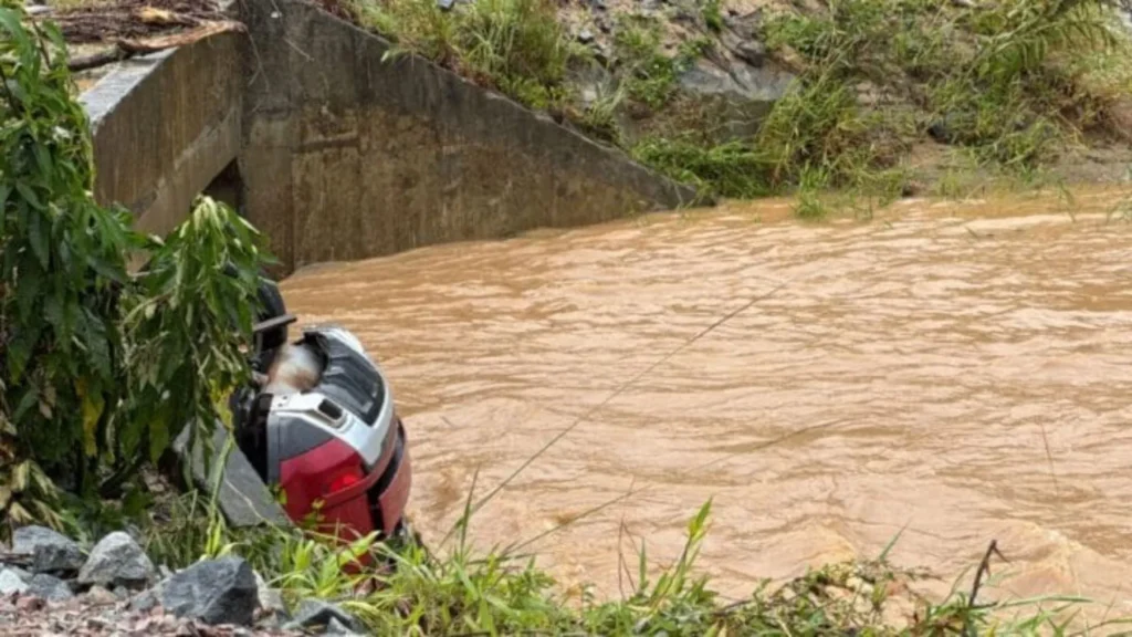 O carro, uma Land Rover vermelha, acabou submerso no rio que corta a região conhecida como Morro do Gato, dificultando o trabalho das equipes de resgate.