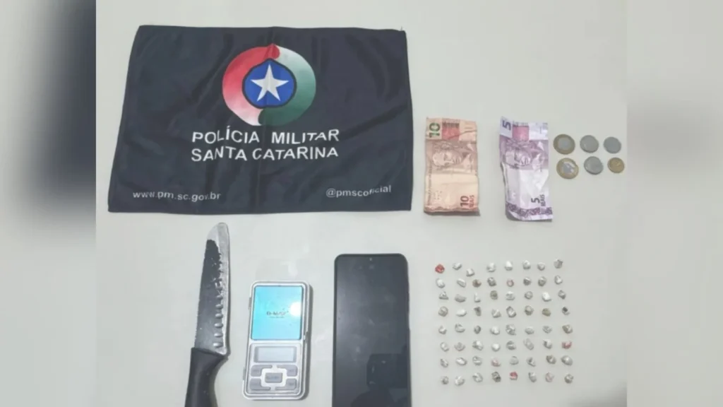 Os policiais também apreenderam uma balança de precisão digital, dinheiro e diversos materiais usados no comércio de drogas, incluindo “faca de cozinha” e “celular”.