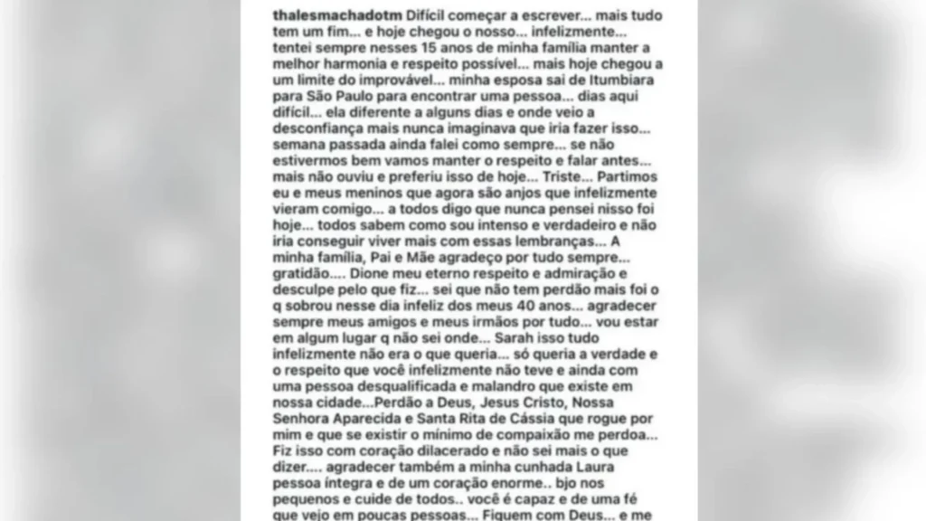 Em postagem nas redes sociais, Thales mencionou dificuldades no casamento e afirmou ter agido em um momento que considerou 'o limite do improvável'