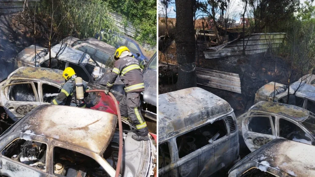 Cerca de sete carcaças de veículos estavam em chamas, gerando intensa fumaça e risco de propagação do fogo para áreas próximas.