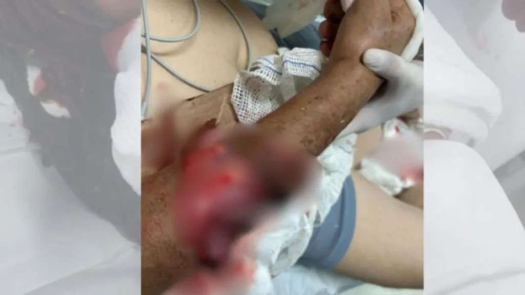 Imagens divulgadas por familiares evidenciam a gravidade do ataque. Um dos braços de Sebastião apresenta lesões profundas, com dilacerações extensas na pele, resultado da força da mordida do cão.