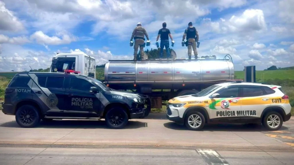 Os policiais abordaram um caminhão Ford Cargo 1519, emplacado em Osasco (SP), adaptado com implemento de coleta de leite.