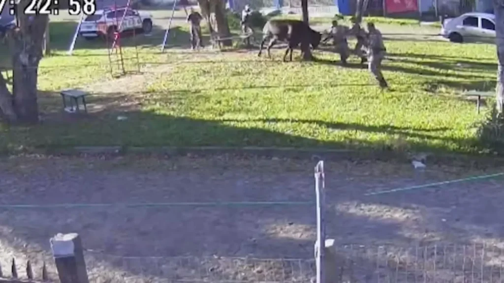 Um touro solto na Avenida Nilo Wulff, no bairro Restinga, em Porto Alegre, atacou policiais militares e feriu um deles na quarta-feira (05). O momento foi registrado por câmeras de segurança de uma residência próxima.