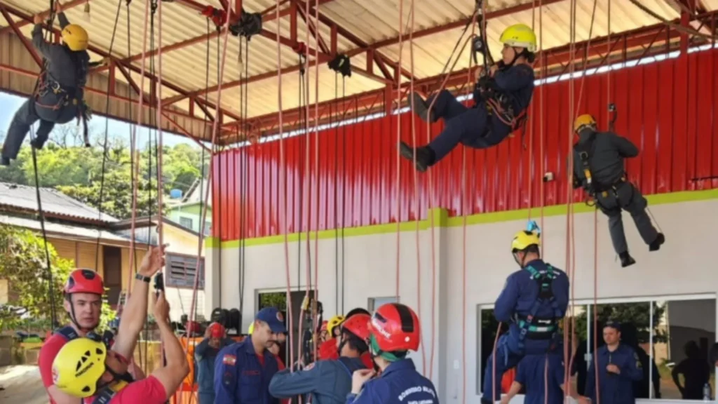 Durante a manhã, os bombeiros participantes tiveram contato com novos equipamentos de resgate, realizando oficinas práticas de acesso e descida por cordas.