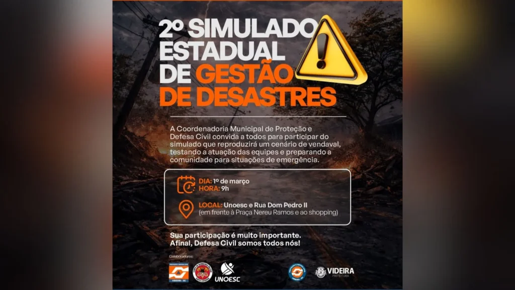 No próximo domingo (1º), a cidade de Videira será palco do 2º Simulado de Gestão de Desastres Naturais, promovido pela Prefeitura, por meio da Coordenadoria Municipal de Proteção e Defesa Civil. O exercício, que começa a partir das 9h, terá como cenário um vendaval, colocando à prova protocolos de emergência, tempo de resposta e a capacidade de mobilização das equipes envolvidas.